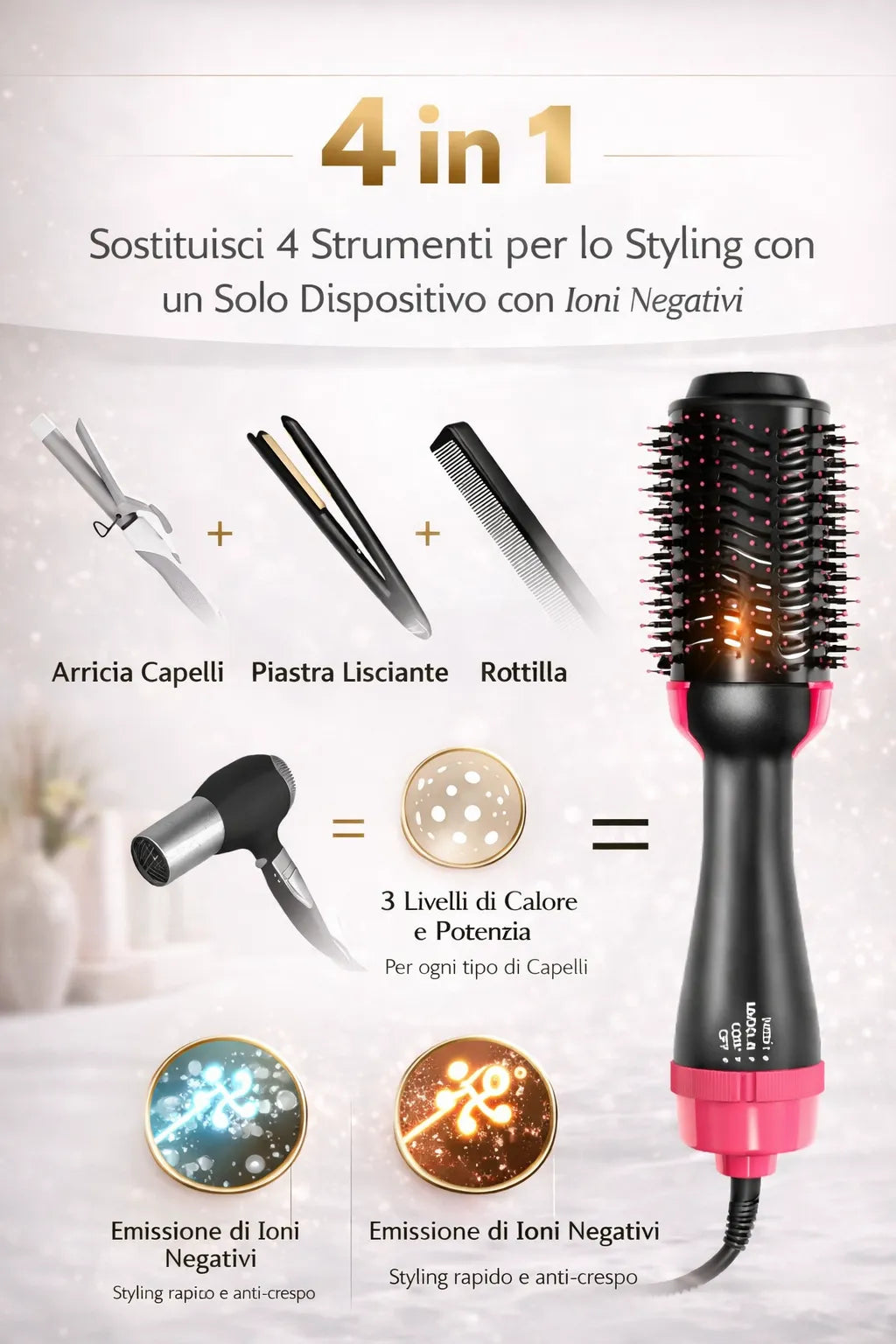 Gli ioni negativi aiutano a ridurre il crespo, limitare l’effetto statico e mantenere i capelli più lisci, luminosi e disciplinati durante lo styling.